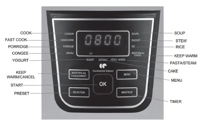Press this button to start Keep Warm function or turn off any Menu functions. Display show “66” means keep warm function is working. Display show “—-” means the cooking has been canceled and the appliance is in standby mode.