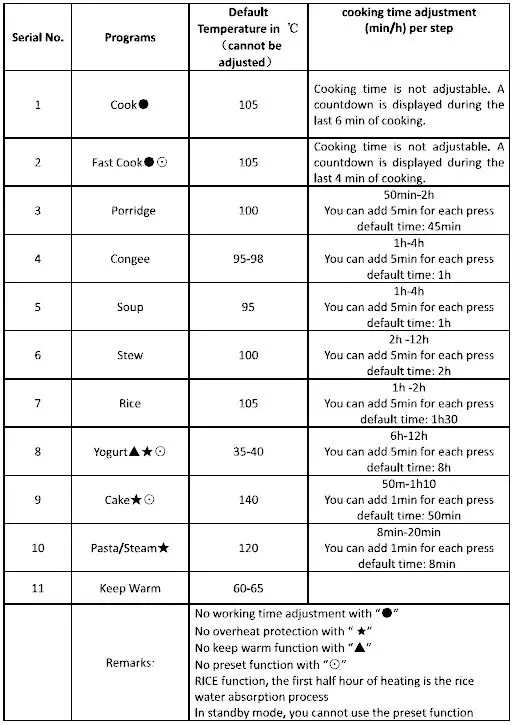 NOTE: The preset function is available for COOK, PORRIDGE, CONGEE, SOUP, STEW, RICE and PASTA/STEAM only.