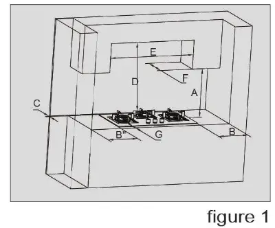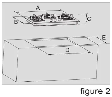 Create an opening with the dimensions shown in figure 2. Place the hob in the cutout, and then make a hole with dimensions 150mme150mm under the cooktop and on the side of the kitchen cupboard in order to meet the air supply.