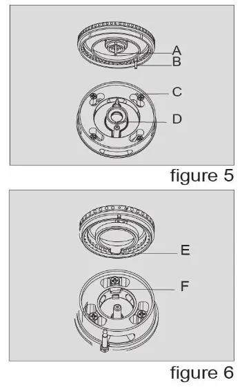 To fix the burner, please do as below: Point the locating pin A to the locating hole D and point the locating pin B to the locating hole C. If there’s a small burner, put part E to part F. Please make sure the fire caps are placed right and they can’t be turned to the left or right side.