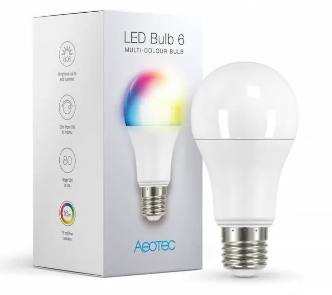 Aeotec LED Bulb 6 (https://aeotec.com/z-wave-led-lightbulb) has been crafted to power connected lighting using Z-Wave Plus (http://aeotec.com/z-wave-plus). It is powered by Aeotec’s Gen5 (http://aeotec.com/z-wave-gen5) technology and features Z-Wave S2 (https://aeotec.com/z-wave-s2).