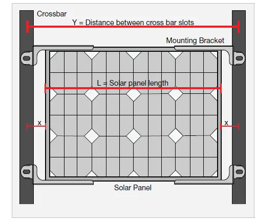 Maximum space between crossbar slots for bracket to be compatible Ymax = 172 mm + L (6.7″ + L) X is the distance between the crossbar slot and the solar panel on either side of the solar panel. X should be equal on each side and be between 17 mm (0.6″) to 86 mm (3.4″).