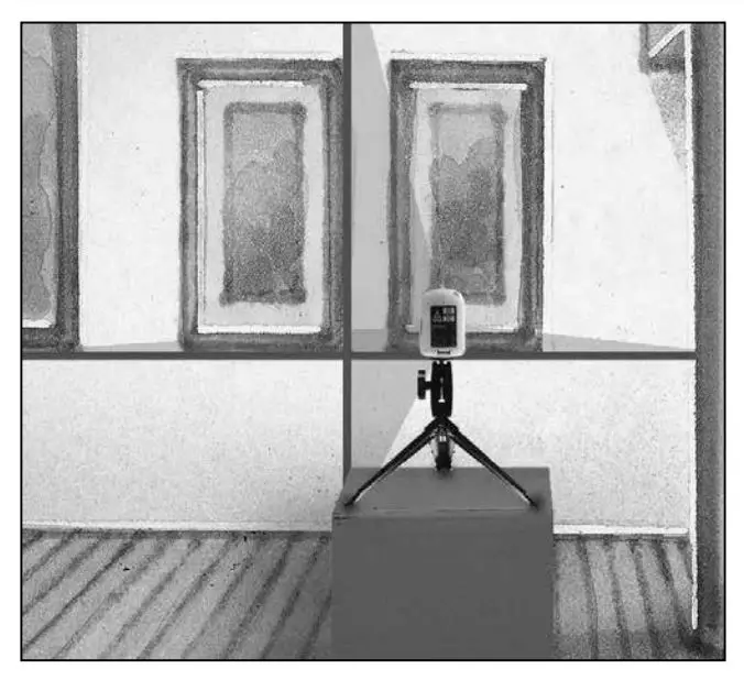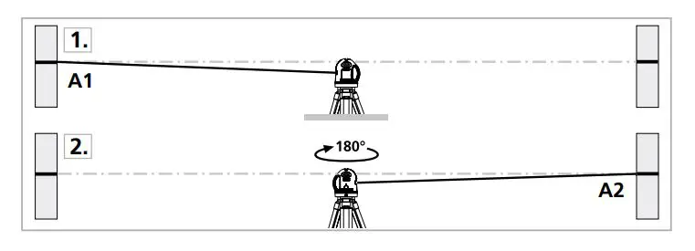 device midway between 2 walls, which must be at least 5 metres apart. Switch the device on (LASER CROSS ON). The best calibration results are achieved if the device is mounted on a tripod.