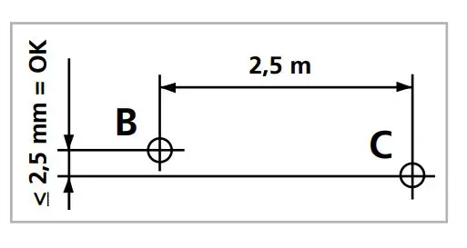 Position the device about 5 m from a wall and switch on the cross laser. Mark point B on the wall. Turn the laser cross approx. 2.5 m to the right and mark point C. Check whether the horizontal line from point C is level with point B to within ± 2.5 mm. Repeat the process by turning the laser to the left.