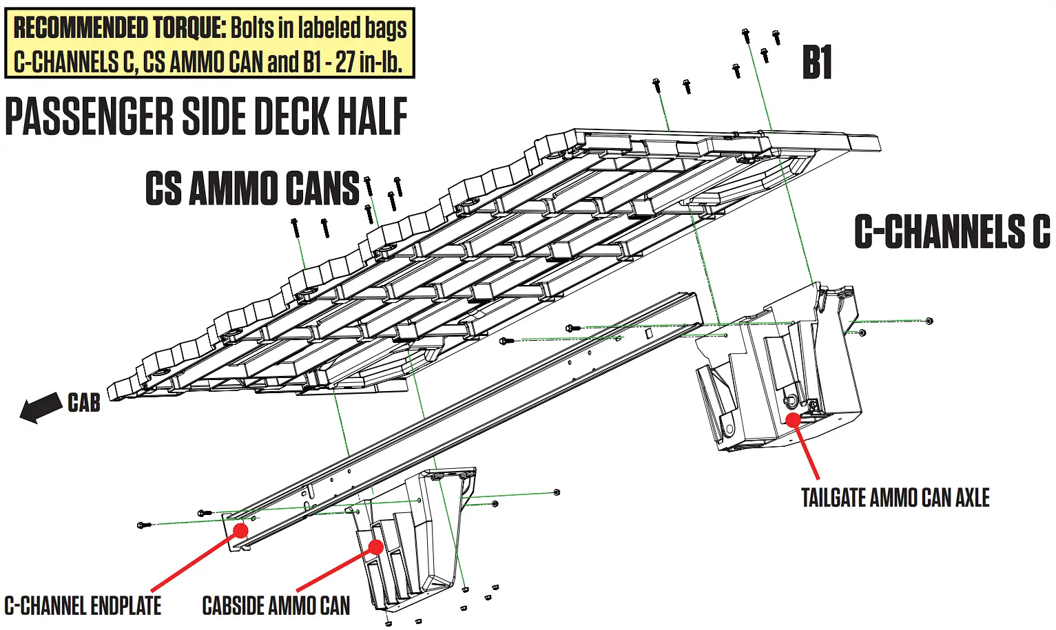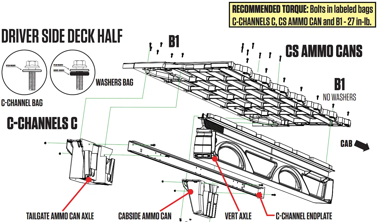 - Bolt the deck to the ammo cans; BAG B1 (with nylon and rubber washers) for the tailgate ammo can, BAG CS AMMO CAN (with nylon and rubber washers) for the cabside ammo can.