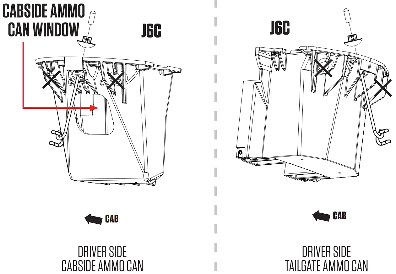 - Insert the J-hook through center hole on the passenger side cabside ammo can and loop J-hook through tie down