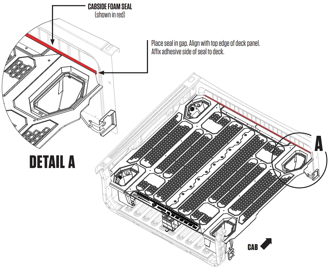 - Climb up on deck and place foam seal in the gap between the deck and cabside panel with the adhesive side facing the deck, not the truck, as shown in DETAIL A. The top edge of foam seal should be level with the top edge of the deck. NOTE: Depending on how the seal is unrolled, the paper carrier may not end up on the adhesive side of the seal. Check for stickiness in determining the adhesive side of the seal.