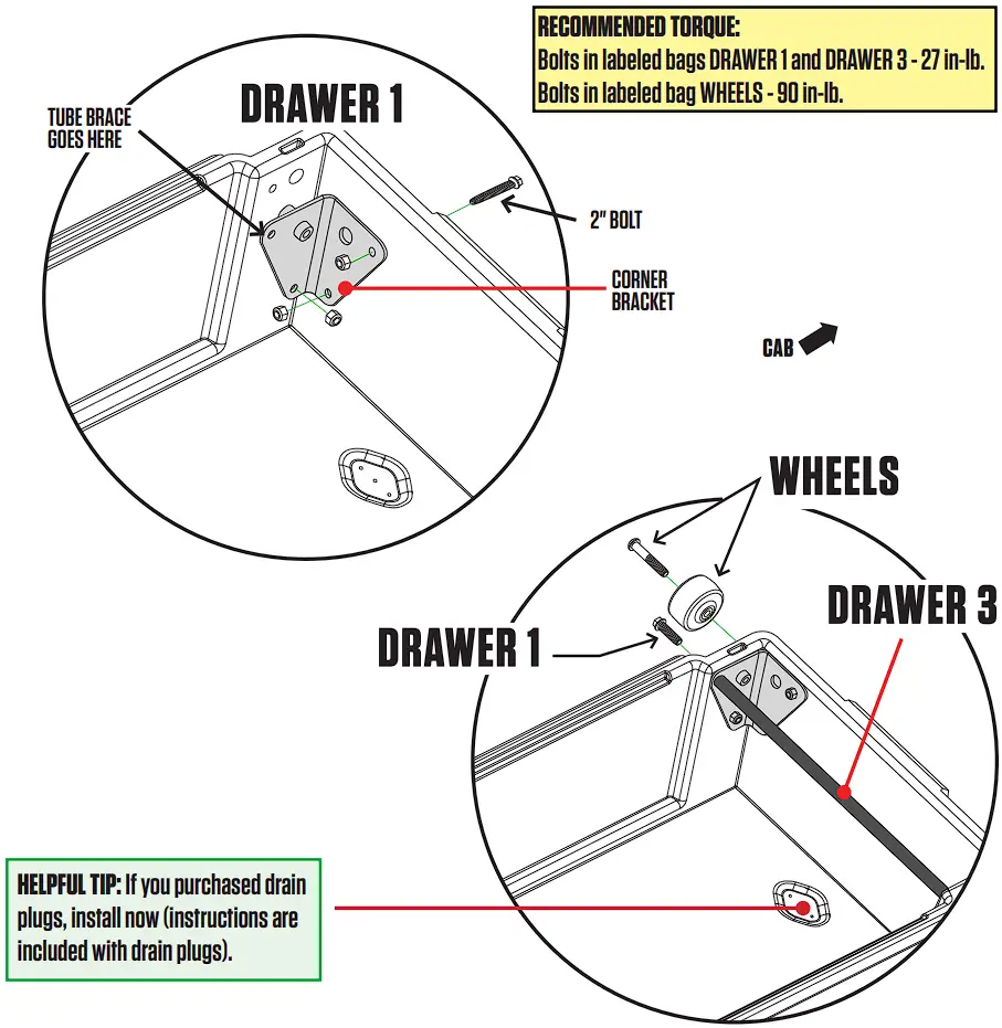 - Install a tube brace in each drawer with two 3/4″ length bolts; BAG DRAWER 1, BAG DRAWER 3.