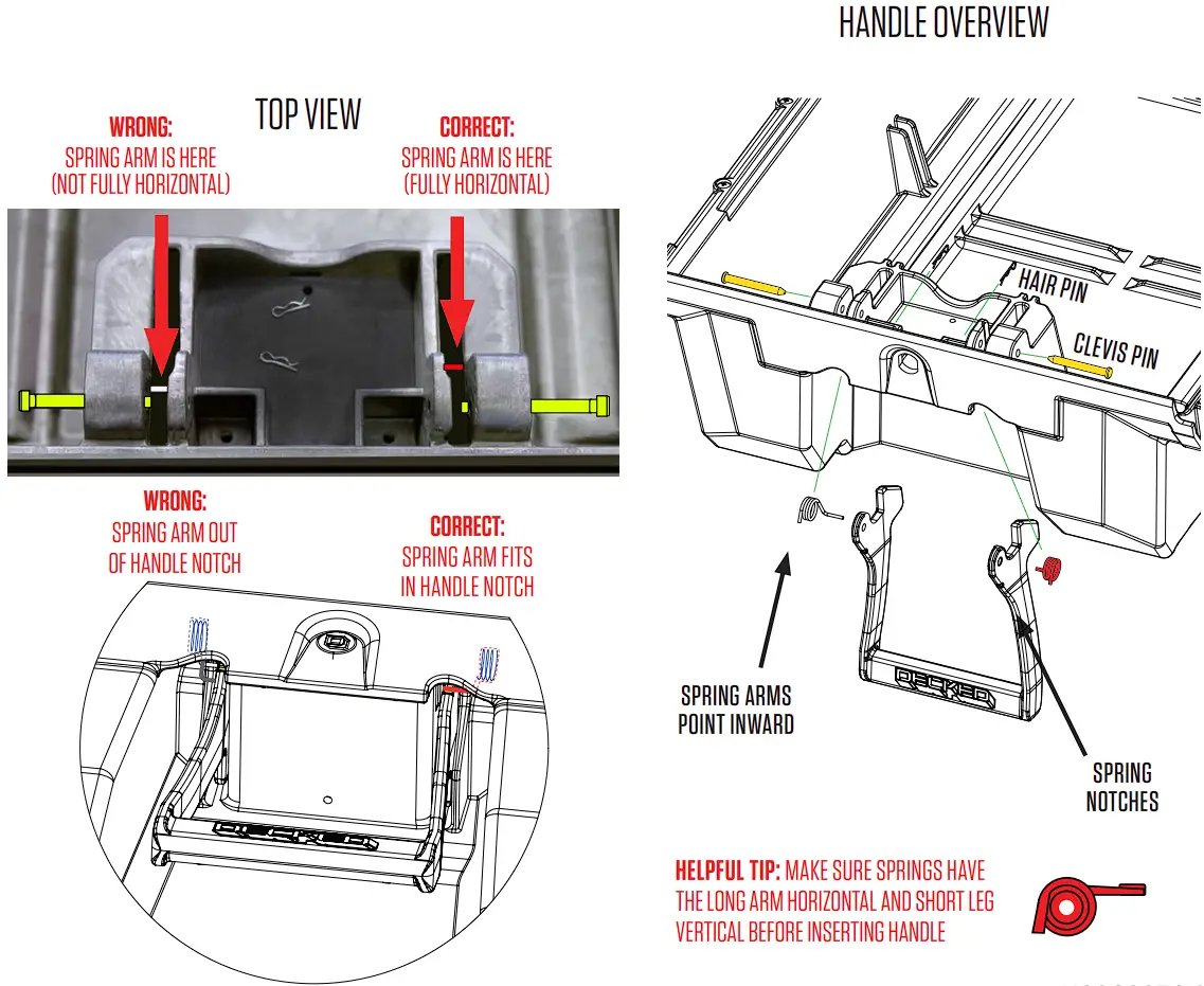- With DECKED logo facing outward, insert the handle ends behind the spring arms. Rotate the arms of the handle toward the clevis pins, pulling the spring arm downward. When the handle hole is lined up with the clevis pin, push the pin through the handle hole and through the inside drawer hole. Repeat on the other side of the handle.