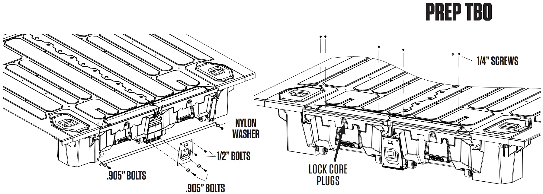 - Grab your buddy to help you lift the driver side assembly into the driver side of the truck bed. Lift the passenger side assembly into the passenger side of the truck bead and seat the passenger side deck on the upstanding vert bosses
