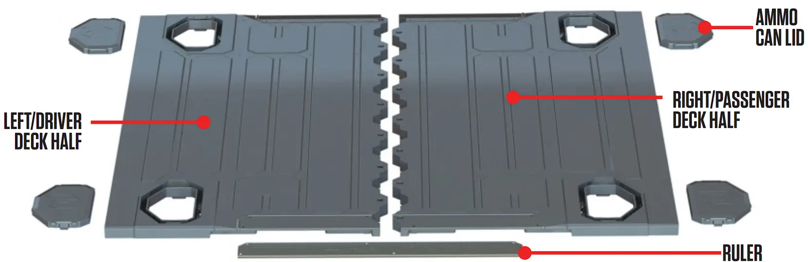 - Line up the passenger’s side deck (sticker on end of deck panel indicates RIGHT/PASSENGER) on top of the C-channel/ammo can assembly.