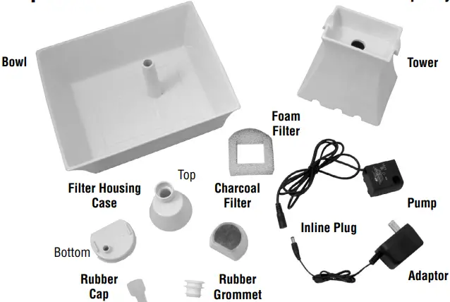 - Once the fountain is completely disassembled, you will have: the ceramic bowl and tower, two rubber pieces, the filter housing case, a charcoal filter, foam filter and the pump.