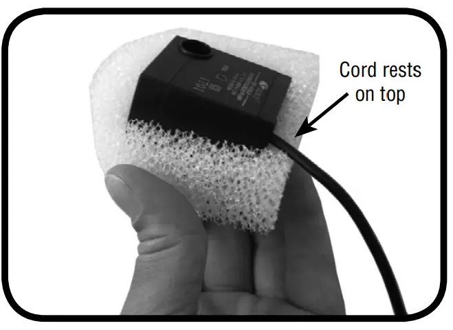 - Place the foam filter around the pump by inserting the pump into the filter from the top, make sure the cord rests on top of the filter (Fig.1).