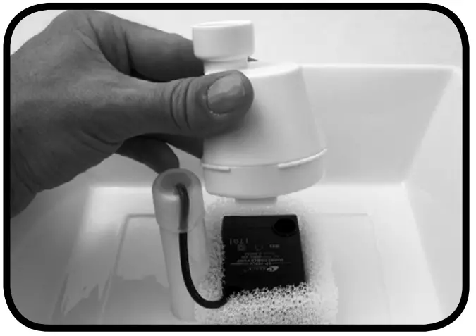- Place the pump inside the foam filter (Fig. 1, Pg 3) then place inside the square indention. Make sure the circular opening on top of the pump is positioned in the bottom left corner (Fig. 16).