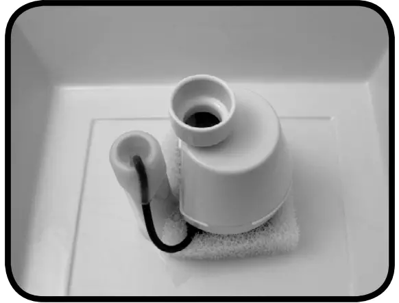 Press down on the pump toengage the suction cups. Once the pump is securely in place, feed the cord over and through the raised post and out the notch on the bottom side of the bowl (Fig. 17, Pg 10).