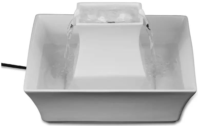 The fountain is equipped with two types of filters that should be replaced on a regular basis. A charcoal filter removes bad tastes and odors, keeping water fresh. A foam filter collects hair and debris and prevents it from reaching the pump, providing optimal filtration. The filters together will keep the pump cleaner and provide fresher water to your pet.