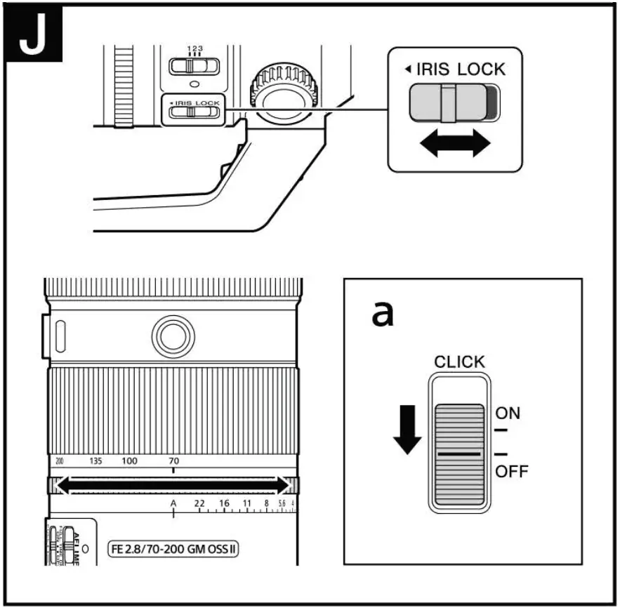 Set the aperture click switch to “OFF” when shooting movies. (See illustration J-a.)