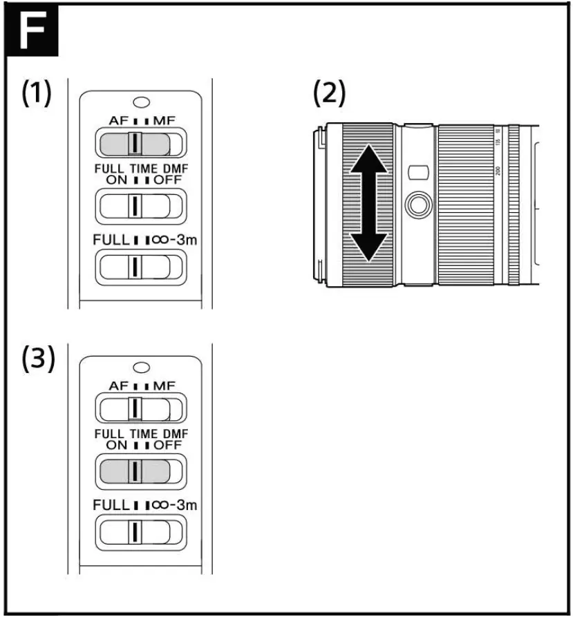- With the full-time direct manual focus switch slid to ON, the focus mode automatically switches to MF when the focusing ring is rotated, regardless of the AF mode setting and the focus adjustment (3).