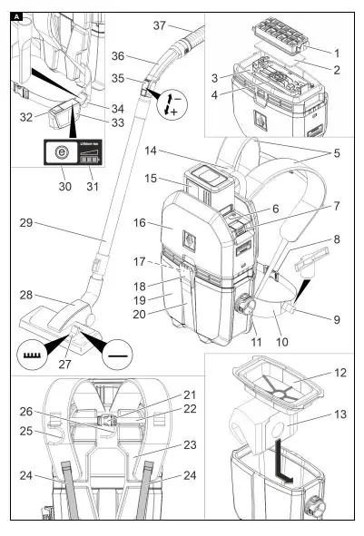 25 Hook for telescopic suction pipe on shoulder straps