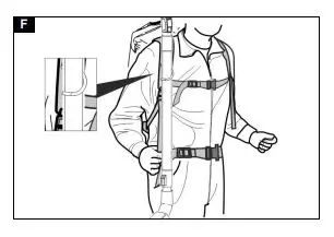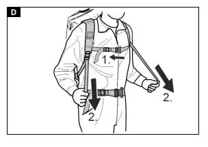 3. Engage the buckle of the chest strap and adjust the chest strap (height adjustable). Adjust the device to the body by pulling on the Centre straps. Do not put on too tight, the main load should be on the hip belt.