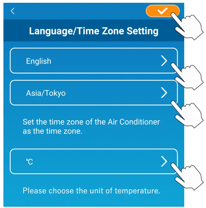 Select which language to use in the application. Select the region in which the air conditioning unit is installed. Select the unit of temperature displayed in the application. Finally, tap