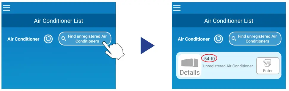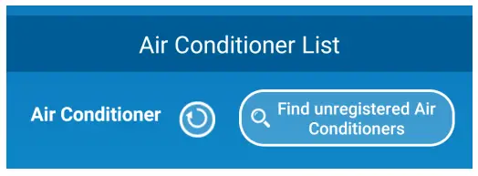 Tap the [Find unregistered Air Conditioners] button to display unregistered air conditioners on the application.