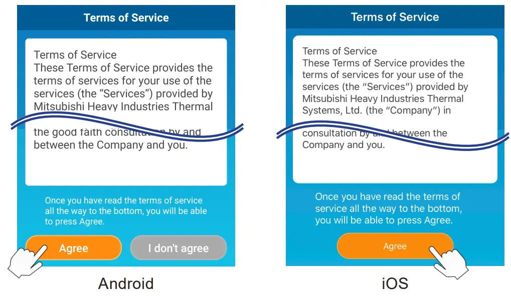 on the top right to complete the setting. - The “Terms of Service” screen appears. Read and check the statement in full. To consent and proceed with using the application tap [Agree]. Selecting [I don’t agree] will exit the application.