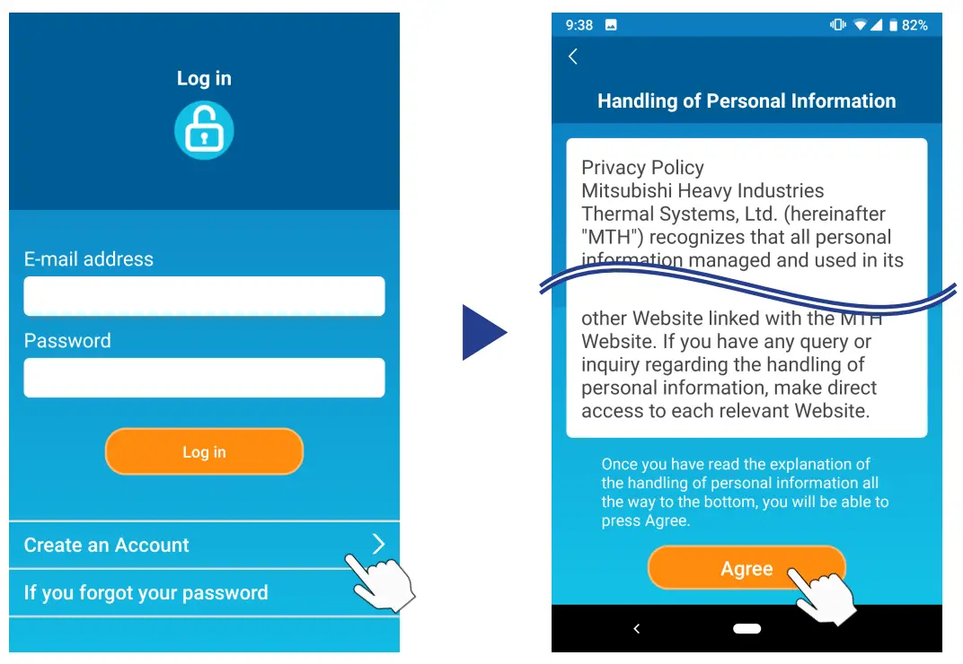Tap [Create an Account]. The “Handling of Personal Information” screen appears. Read and check the statement in full. To consent and proceed with using the application tap [Agree].