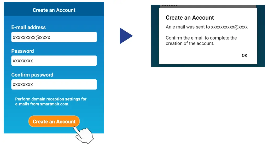 - The “Create an Account” screen appears. Enter your e-mail address and password Tap the [Create an Account] button. The pop-up message “Create an Account” appears, to confirm tap [OK].