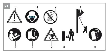 - Before you start work, inspect the cordless pole hedge trimmer for damage. Never use equipment which is obviously damaged.