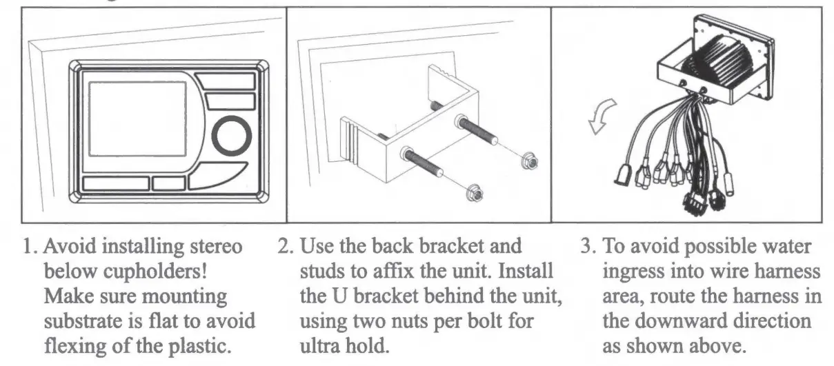 - Make sure that the black wire on the wiring harness is connected to a good ground point on the boat. If the chassis of the boat is used as a ground point, make sure that the surface is scraped clean of paint before attaching the wire to it. It is recommended to connect the black ground wire directly to negative terminal (-) of the boat battery.