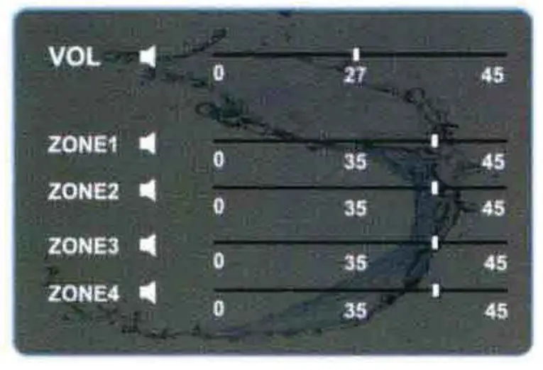 In any source playing status, turn VOL knob to adjust volume level. NOTE: VOL refers to main volume. Zoncl , Zone2, Zone3, Zone4 level will change along with VOL adjust.