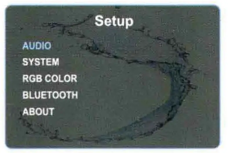 At Home Screen tum VOL knob and press it to enter SETUP, then tum VOL knob to move amongst Audio, System, RGB Color, and Bluetooth, About. Press the knob at desired feature and tum the knob again to adjust the Level. Press the knob again to exit current feature adjustment.