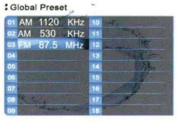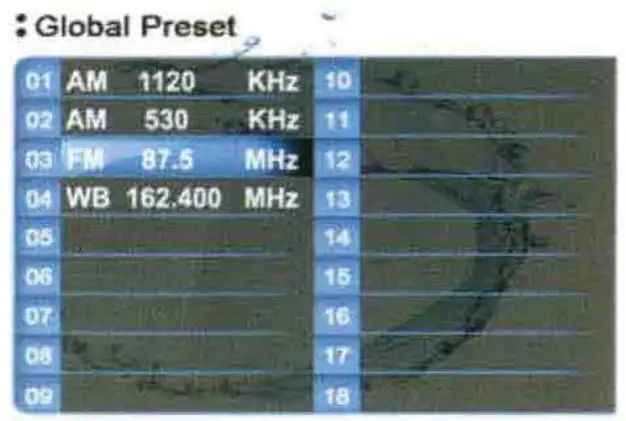 At your favorite station, press MENU button to enter Radio Settings, press VOL knob at SAVE AS PRESET to show the Global Preset List, then turn VOL knob to select a preset No. and press it to save the station into Preset List. The Preset No. will display once the station is saved.