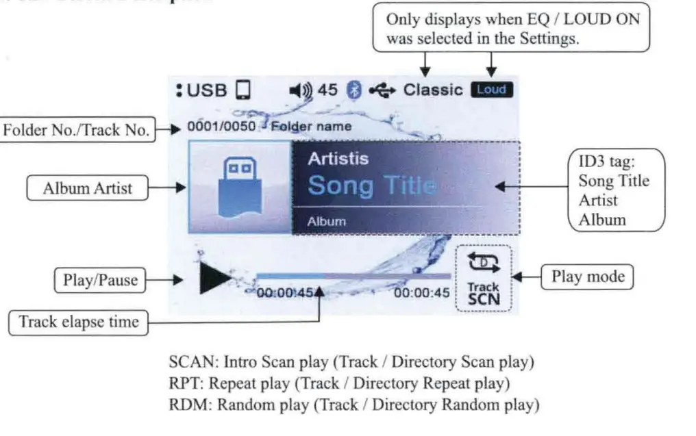 – Select Random All to play all the tracks in the USB device randomly.