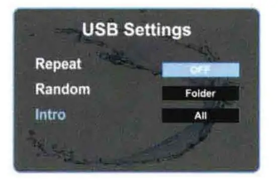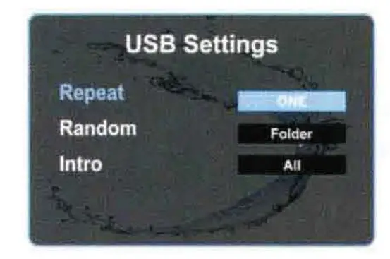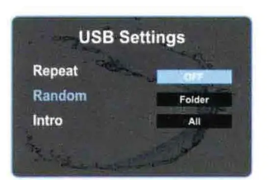 While USB is playing, simply press MENU button to show USB settings, tum VOL knob and press it at Intro, then turn VOL knob to select off, folder, or all.