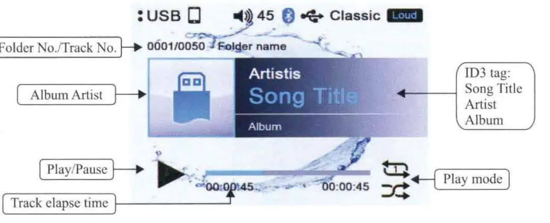 Once the unit power on, the introductory home screen appears for 5 seconds, then switches to the last played mode before power off occurred.