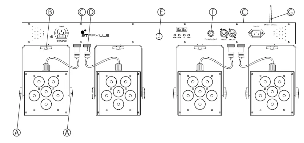 | Light source | 24 × RGBW LED type Quad 4-in-1, 8 W, on four moveable Flat PARs | |