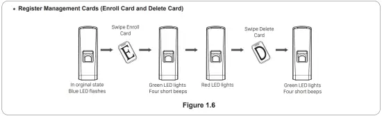 Power the device by DC 12V and blue LED flashes fast and Fingerprint Sensor lights with beeps.