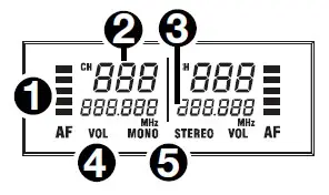 Right stereo channel. When you are finished adjusting the voume, wait five seconds to exit volume adjustment mode. - Display: This display shows the current channel, frequency, and AF volume level. See Display for more information.