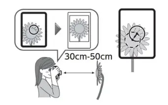 - When holding the camera closer than 19.7 inches (0.5 m) from the subject, use the selfie mode. Use the selfie mode to capture a close-up within the range of 11.8 inches to 19.7 inches (30 to 50 cm).