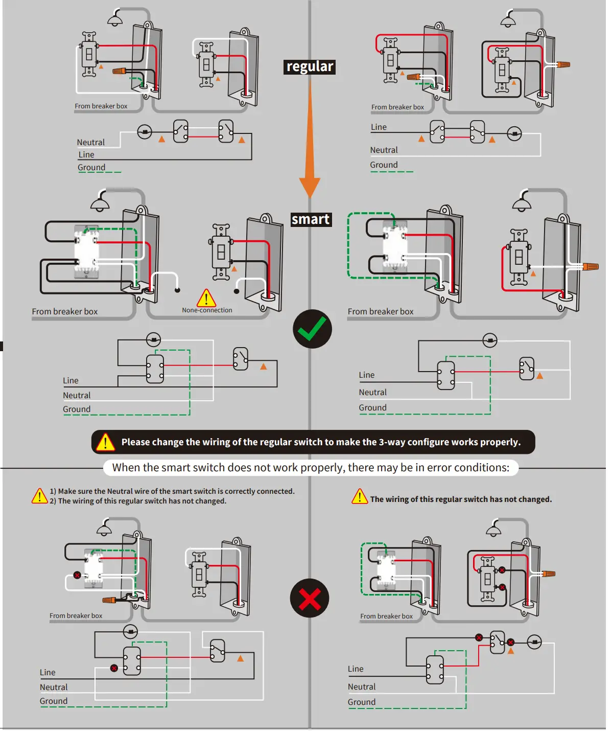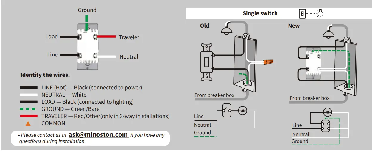 - Wire gauge requirements: use 9 AWG or larger wires suitable for at least 80° C for supplying Line (HOT), Load, Neutral, Ground and Traveler connections.