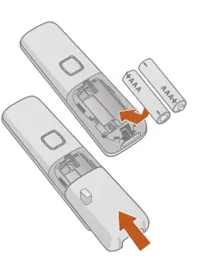 Remove the battery cover located on the back of the handset by sliding it away from the center of the device. Insert the two rechargeable AAA batteries, making sure that you align the flat end against the springs. Replace the battery cover by sliding it in the opposite direction.