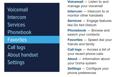 Your Ooma HD3 Handset has an easy-to-use interface that puts the most common features at your fingertips while still letting you access all the advanced features the handsetis capable of.