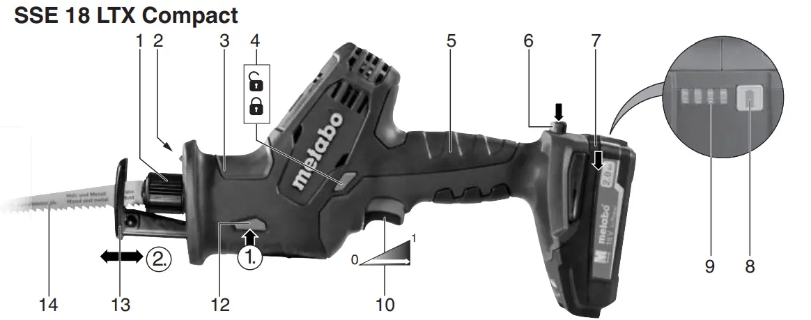 - Switch-on lock: To lock the trigger (10) to prevent the tool from switching on inadvertently.