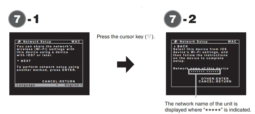 - Press the cursor key () when the WAC screen -1 is displayed on the TV, and confirm the unit’s network name displayed on the screen.