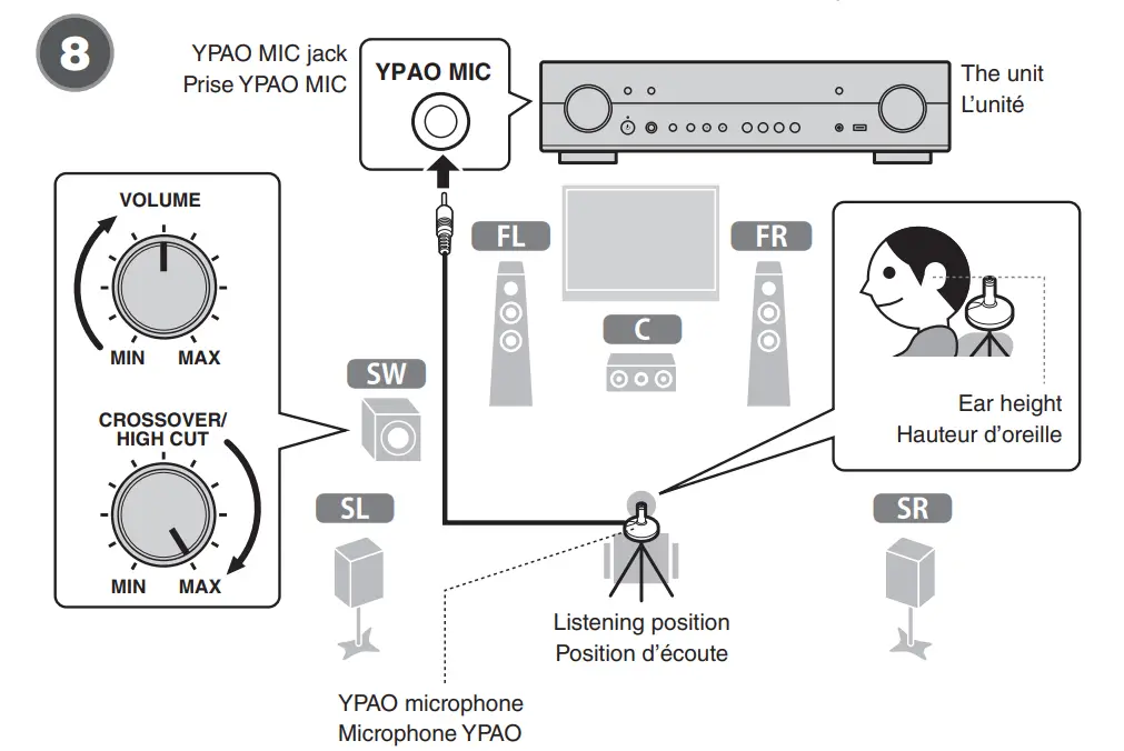 - Place the YPAO microphone at your listening position and connect it to the YPAO MIC jack on the front panel. Screen -1 appears on the TV. Place the YPAO microphone at your listening position (same height as your ears). We recommend the use of a tripod as a microphone stand. You can Use the tripod screws to stabilize the microphone.