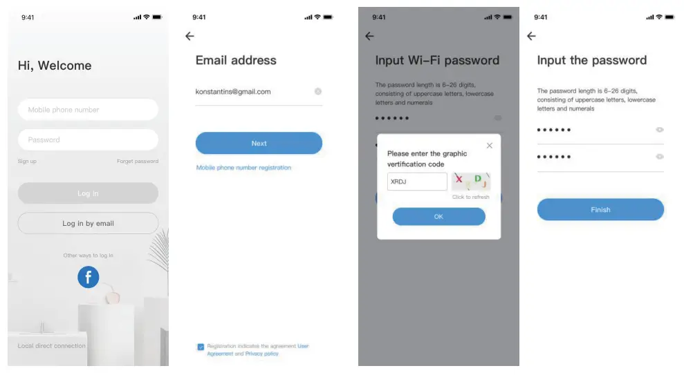 - When you use this app at the first time, you need to use your email to register an account, click “Sign Up “and set a password according this procedure, or choose Long in with mobile phone number.