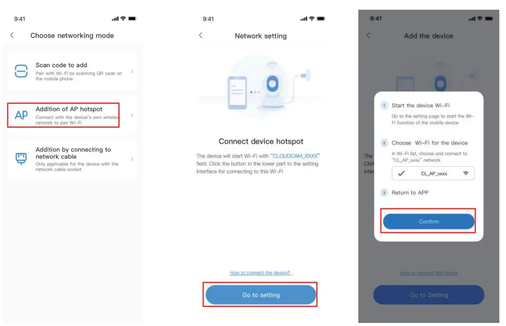 - please go to the Wi-Fi list and connect the Wi-Fi in the blue field “CLOUDCAM_XXXX” Select the Wi-Fi that matches the prefix and connect Return to APP after successful connection.