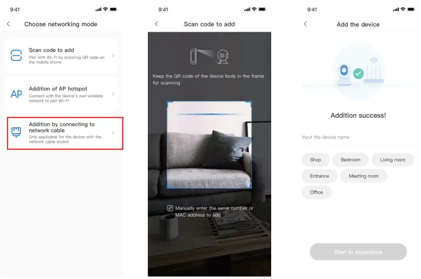 - Plug in the power to the camera, Device network port is connected to the network cable Scan device body QR code, put the QR code on the device body into the box and scan it.
